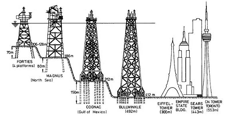 Bandingkan juga tinggi dari beberapa anjungan minyak lainnya dengan bangunan-bangunan tertinggi di dunia ("Troll A" tidak ada dalam gambar, tapi tingginya mencapai 472 meter):